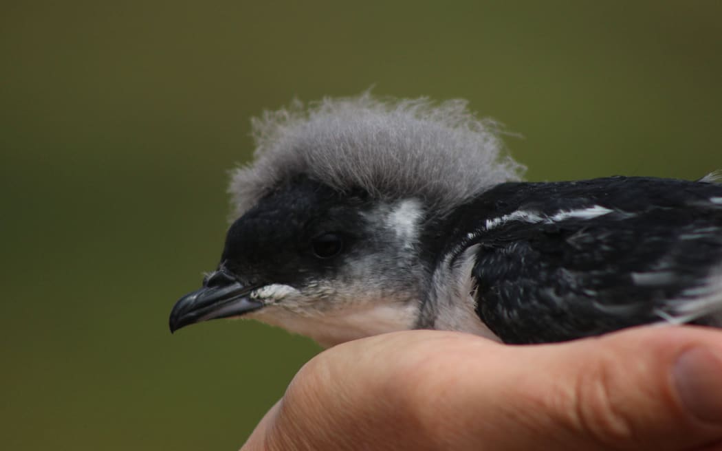 A newly translocated Whenua Hou diving petrel of almost seven weeks old, January 2025. Almost all of its newborn fluff has been shed, except on its head. Photo: Te Arawhetu Waipoua - Department of Conservation