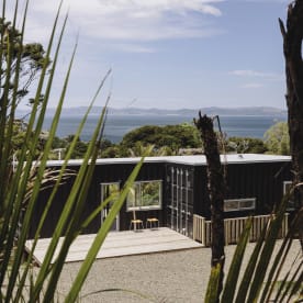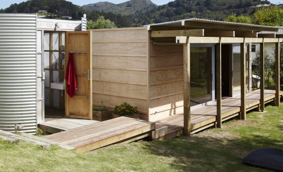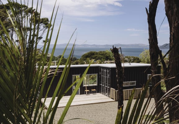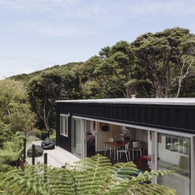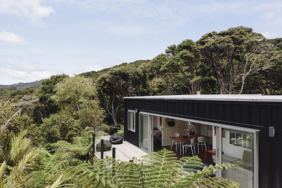 Container Bach 45m2, Tuateawa, Coromandel. A container bach was chosen largely because it could be built off-site and installed with minimal disruption to the regenerating bush that surrounded the building platform.