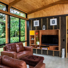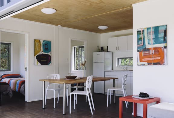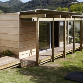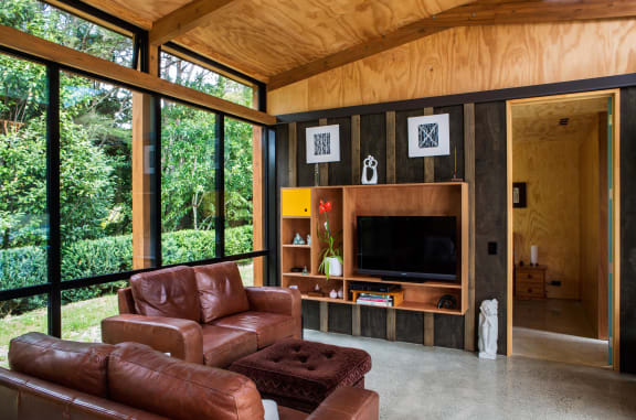 Valentine House 57m2, Titirangi, Auckland. A band-sawn, dark-stained unit made from the type of board-and-batten construction popularised in the area in the 1970s playfully alludes to the design origins.