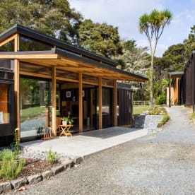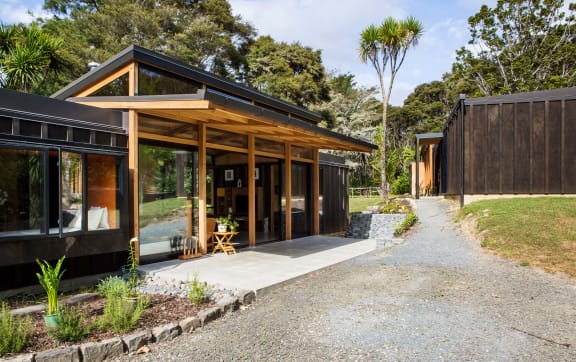 Valentine House 57m2, Titirangi, Auckland. A secondary dwelling, placed near but angled away from the adjacent major dwelling. The wide eave of its north-facing porch is visually striking and offers shading from excess summer sun.