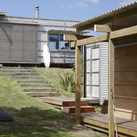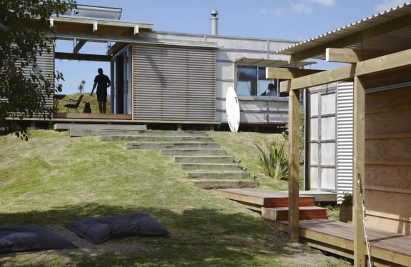 Te Modular 87m2, Medlands Beach, Great Barrier. In this configuration of the Te Modular system the corrugated iron-clad bathroom is situated adjacent to the sleeping quarters; Connections between the three pods on the sloping site are achieved via staircases and walkways.
