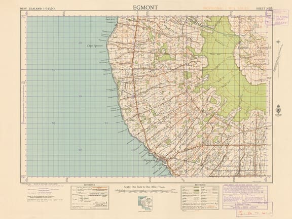 1943 Mount Egmont Map – full: this is a map from the first national topographic map series, the NZMS 1. Begun in 1943, this series was completed quickly using painstaking manual techniques amid fears of Japanese invasion during World War Two.