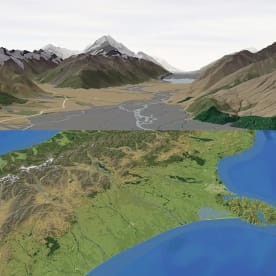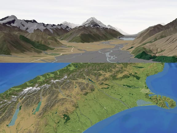 3d Mapping by Geographx – Wellington map design firm Geographx use our data as well as other information to create map products, include 3D maps which are used in publications and for the TV weather report. This image shows Mount Cook as well as the South Island (Image Credit: Geographx)