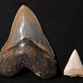 Fossil tooth of the extinct “megatooth shark”, Carcharodon megalodon (left) & a tooth from the living great white shark (right).
