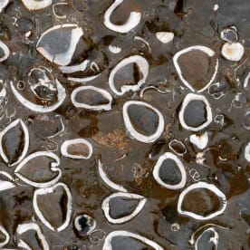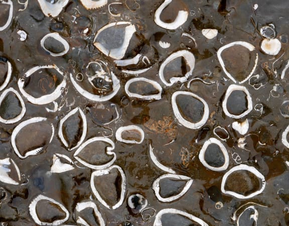 Cross-sections of 10 million-year-old fossil clams in the worn surface of a boulder, Putangirua Stream, Wairarapa; the field of view is about 50 cm wide. Photo: James Crampton.
