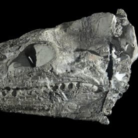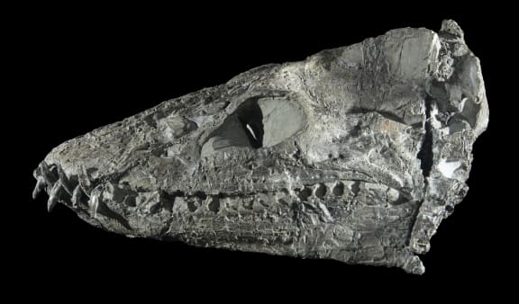Skull of the elasmosaur Tuarangisaurus keyesi, a long-necked marine reptile about eight metres long that lived about 80 million years ago, at the same time as the dinosaurs. This specimen comes from the ranges of inland Hawkes Bay. Specimen from the National Paleontological Collections, GNS Science. Photo: Marianna Terezow.