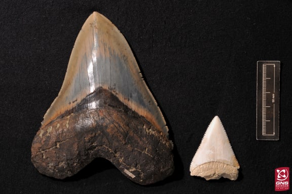 Fossil tooth of the extinct “megatooth shark”. Carcharodon megalodon (left) and, for comparison, a tooth from the living great white shark (right). The megatooth shark was perhaps 25 times the weight of the great white shark. This fossil is between 5 and 10 million years old and is from the Westport area. Specimen from the National Paleontological Collections, GNS Science, Lower Hutt. Photo: Marianna Terezow.