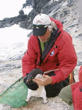 Penguin being released after having its wing band adjusted