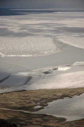 About 20 of the Cape Crozier penguin colony Ross Ice Shelf in background