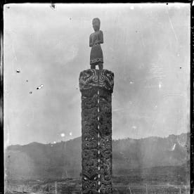 Carved wooden Maori cenotaph at Te Koura, in memory of those who died in influenza epidemic. Photographed in 1920 by Albert Percy Godber. Ref: APG-0786-1/2-G. Alexander Turnbull Library, Wellington, New Zealand.