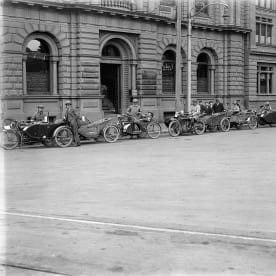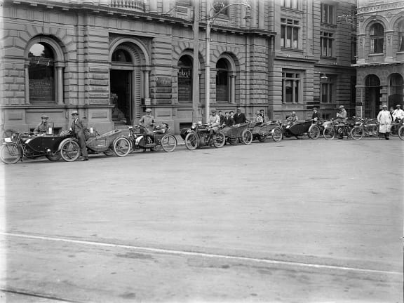 Emergency Motorcycle Corps, during the 1918 influenza epidemic, Christchurch. The Press (Newspaper) :Negatives. Ref: 1/1-008543-G. Alexander Turnbull Library, Wellington, New Zealand.