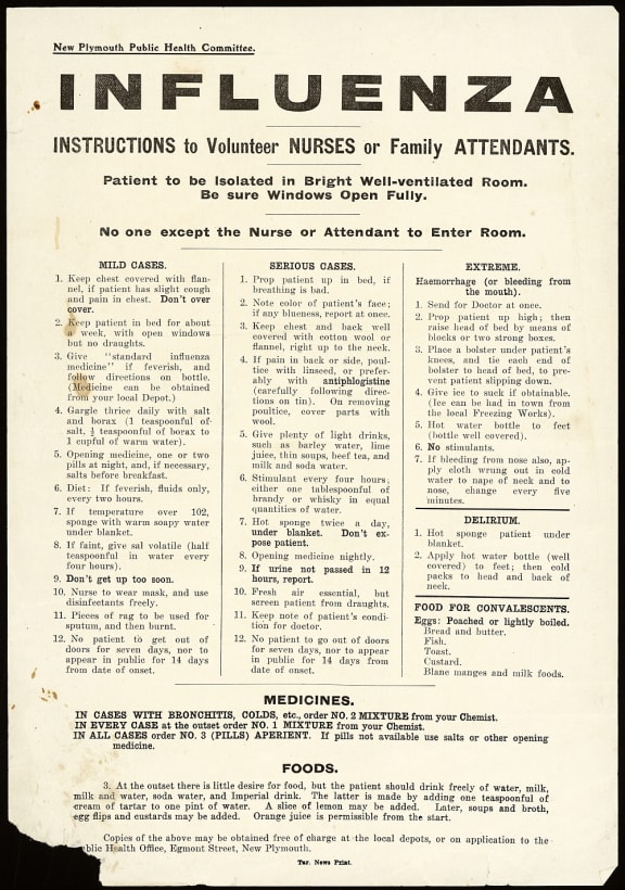 New Plymouth Public Health Committee. New Plymouth Public Health Committee :Influenza; instructions to volunteer nurses or family attendants. Tar[anaki] News Print [1918?]. Ref: Eph-B-HEALTH-1918-01. Alexander Turnbull Library, Wellington, New Zealand.