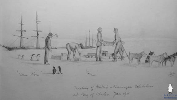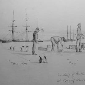 Sketch by Victor Campbell of the meeting of the Terra Nova and Fram, Bay of Whales (Courtesy of the QEII Library, Memorial University of Newfoundland).