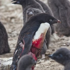 An Adelie Penguin worse for wear after an encounter with a Leopard Seal.