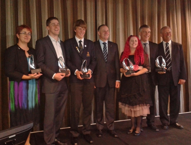 The winners of the 2013 PM's Science Prizes are, from left to right, Fenella Colyer, head of physics at Manurewa High School (Science Teacher Prize), Benjamin O'Brien, CEO of StretchSense Ltd (MacDiarmid Emerging Scientist Prize), Tom Morgan, a Year 13 student at Marlborough Boys' College (Future Scientist Prize), Prime Minister John Key, University of Auckland microbiologist Siouxsie Wiles (Science Media Communication Prize), and the winners of the top award, Grant Covic and John Boys, both from the University of Auckland. (image: V Meduna)