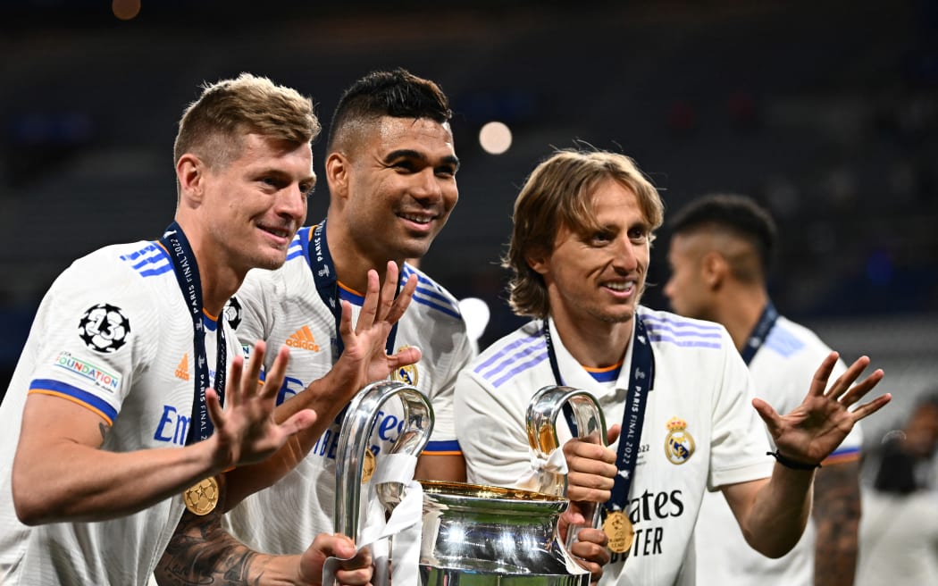 Real Madrid's German midfielder Toni Kroos, Real Madrid's Brazilian midfielder Casemiro and Real Madrid's Croatian midfielder Luka Modric pose with the Champions League trophy. Photo: