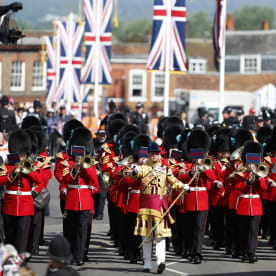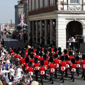 Members of the Irish Guards Regimental Band march along the High Street. Photo: AFP