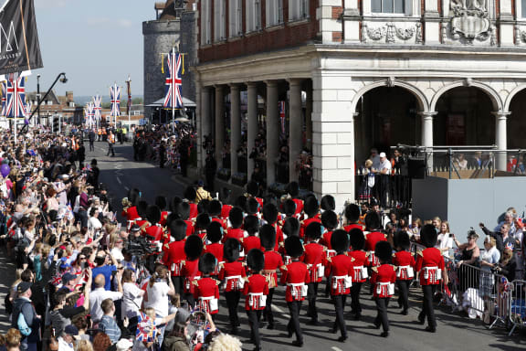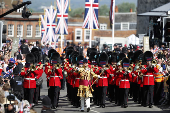 Members of the Foot Guards Regimental Band march along the High Street ahead of the wedding and carriage procession. Photo: AFP
