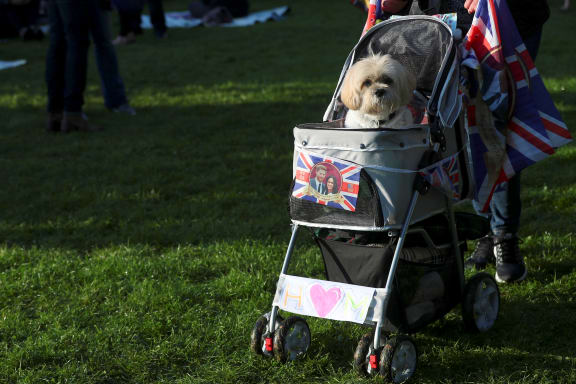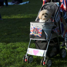 A well-wisher pushes a dog in a decorated dog-carrier on the Long Walk leading to Windsor Castle. Photo: AFP