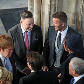 Former england footballer David Beckham and wife Victoria Beckham speak with British musician Elton John and partner David Furnish before the wedding ceremony. Photo: AFP
