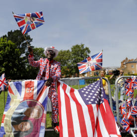 Royal fan Joseph Afrane, bedecked in Union flag colours, poses along the Long Walk in Windsor. Photo: AFP
