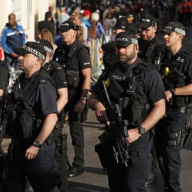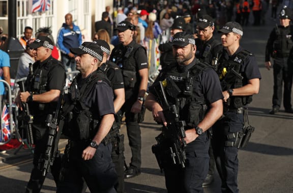 Police officers patrol on the High Street ahead of the wedding and carriage procession. Photo: AFP