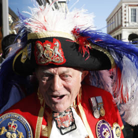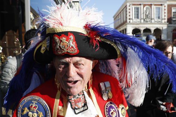 Town crier, Tony Appleton poses on the High Street ahead of the wedding and carriage procession. Photo: AFP