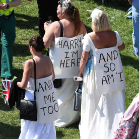 Well-wishers wear mock wedding dresses with banners. Photo: AFP